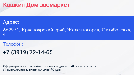 Кошкин Дом, зоомаркет по адресу 662971, Красноярский край, Железногорск, Октябрьская, 4 в дальнейшем Организация, размещена в следующих категориях: