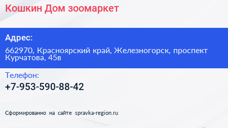 Кошкин Дом, зоомаркет по адресу 662970, Красноярский край, Железногорск, проспект Курчатова, 45в в дальнейшем Организация, размещена в следующих категориях: