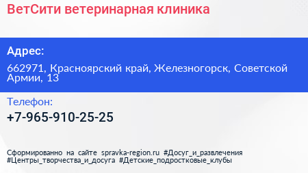 ВетСити, ветеринарная клиника по адресу 662971, Красноярский край, Железногорск, Советской Армии, 13 в дальнейшем Организация, размещена в следующих категориях: