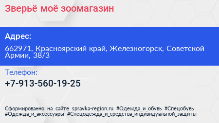Зверьё моё, зоомагазин по адресу 662971, Красноярский край, Железногорск, Советской Армии, 38/3 в дальнейшем Организация, размещена в следующих категориях: