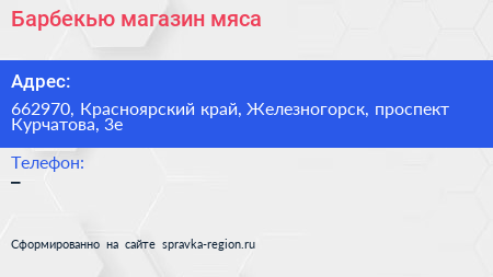 Барбекью, магазин мяса по адресу 662970, Красноярский край, Железногорск, проспект Курчатова, 3е в дальнейшем Организация, размещена в следующих категориях: