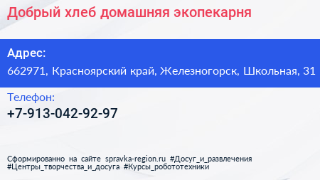 Добрый хлеб, домашняя экопекарня по адресу 662971, Красноярский край, Железногорск, Школьная, 31 в дальнейшем Организация, размещена в следующих категориях: