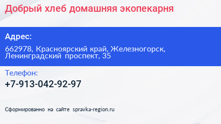Добрый хлеб, домашняя экопекарня по адресу 662978, Красноярский край, Железногорск, Ленинградский проспект, 35 в дальнейшем Организация, размещена в следующих категориях: