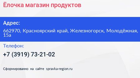Ёлочка, магазин продуктов по адресу 662970, Красноярский край, Железногорск, Молодёжная, 15а в дальнейшем Организация, размещена в следующих категориях: