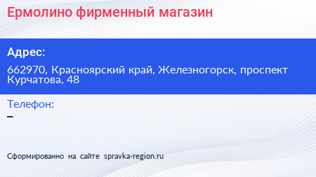 Ермолино, фирменный магазин по адресу 662970, Красноярский край, Железногорск, проспект Курчатова, 48 в дальнейшем Организация, размещена в следующих категориях: