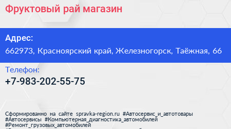 Фруктовый рай, магазин по адресу 662973, Красноярский край, Железногорск, Таёжная, 66 в дальнейшем Организация, размещена в следующих категориях: