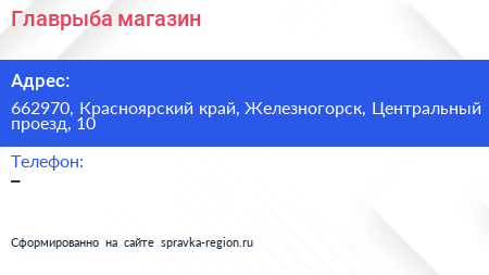 Главрыба, магазин по адресу 662970, Красноярский край, Железногорск, Центральный проезд, 10 в дальнейшем Организация, размещена в следующих категориях:
