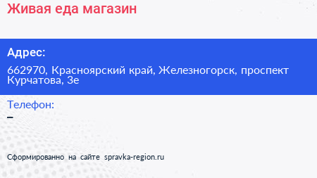 Живая еда, магазин по адресу 662970, Красноярский край, Железногорск, проспект Курчатова, 3е в дальнейшем Организация, размещена в следующих категориях: