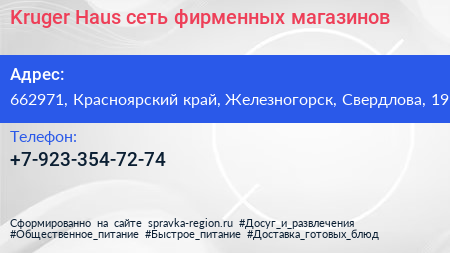 Kruger Haus, сеть фирменных магазинов по адресу 662971, Красноярский край, Железногорск, Свердлова, 19 в дальнейшем Организация, размещена в следующих категориях: