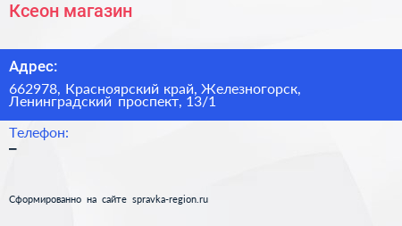 Ксеон, магазин по адресу 662978, Красноярский край, Железногорск, Ленинградский проспект, 13/1 в дальнейшем Организация, размещена в следующих категориях: