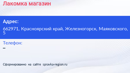 Лакомка, магазин по адресу 662971, Красноярский край, Железногорск, Маяковского, 5 в дальнейшем Организация, размещена в следующих категориях: