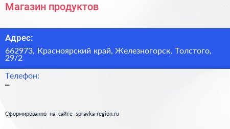 Магазин продуктов по адресу 662973, Красноярский край, Железногорск, Толстого, 29/2 в дальнейшем Организация, размещена в следующих категориях: