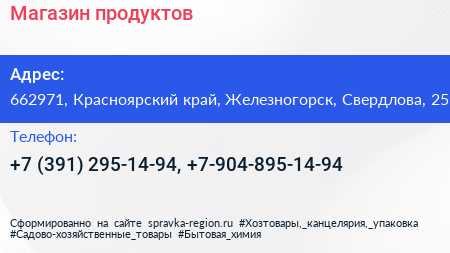 Магазин продуктов по адресу 662971, Красноярский край, Железногорск, Свердлова, 25 в дальнейшем Организация, размещена в следующих категориях: