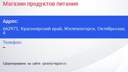 Магазин продуктов питания по адресу 662971, Красноярский край, Железногорск, Октябрьская, 4 в дальнейшем Организация, размещена в следующих категориях: