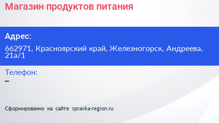 Магазин продуктов питания по адресу 662971, Красноярский край, Железногорск, Андреева, 21а/1 в дальнейшем Организация, размещена в следующих категориях: