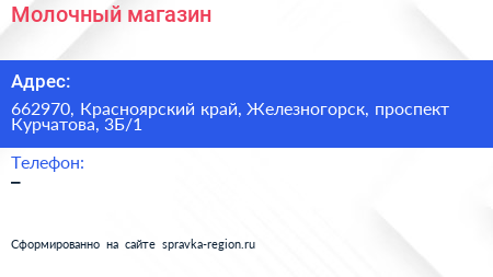 Молочный магазин по адресу 662970, Красноярский край, Железногорск, проспект Курчатова, 3Б/1 в дальнейшем Организация, размещена в следующих категориях: