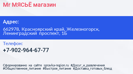 Mr МЯСЬЁ, магазин по адресу 662978, Красноярский край, Железногорск, Ленинградский проспект, 1Б в дальнейшем Организация, размещена в следующих категориях: