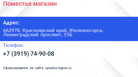 Поместье, магазин по адресу 662978, Красноярский край, Железногорск, Ленинградский проспект, 55Б в дальнейшем Организация, размещена в следующих категориях: