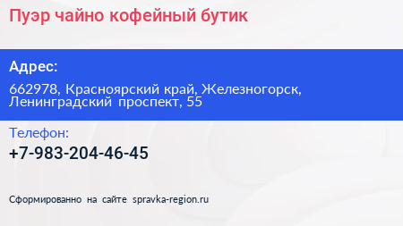 Пуэр, чайно-кофейный бутик по адресу 662978, Красноярский край, Железногорск, Ленинградский проспект, 55 в дальнейшем Организация, размещена в следующих категориях: