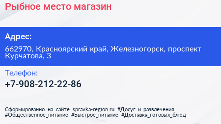 Рыбное место, магазин по адресу 662970, Красноярский край, Железногорск, проспект Курчатова, 3 в дальнейшем Организация, размещена в следующих категориях: