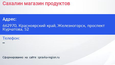 Сахалин, магазин продуктов по адресу 662970, Красноярский край, Железногорск, проспект Курчатова, 52 в дальнейшем Организация, размещена в следующих категориях: