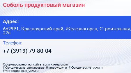 Соболь, продуктовый магазин по адресу 662991, Красноярский край, Железногорск, Строительная, 27в в дальнейшем Организация, размещена в следующих категориях:
