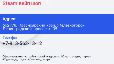 Steam, вейп-шоп по адресу 662978, Красноярский край, Железногорск, Ленинградский проспект, 35 в дальнейшем Организация, размещена в следующих категориях: