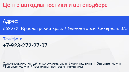 Центр автодиагностики и автоподбора по адресу 662972, Красноярский край, Железногорск, Северная, 3/5 в дальнейшем Организация, размещена в следующих категориях: