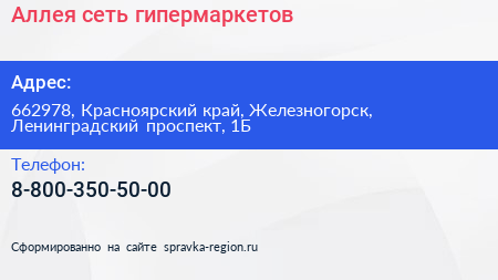 Аллея, сеть гипермаркетов по адресу 662978, Красноярский край, Железногорск, Ленинградский проспект, 1Б в дальнейшем Организация, размещена в следующих категориях: