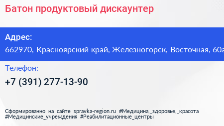 Батон, продуктовый дискаунтер по адресу 662970, Красноярский край, Железногорск, Восточная, 60а в дальнейшем Организация, размещена в следующих категориях:
