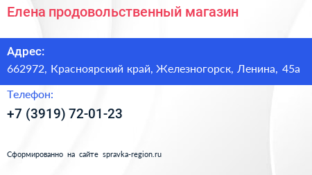 Елена, продовольственный магазин по адресу 662972, Красноярский край, Железногорск, Ленина, 45а в дальнейшем Организация, размещена в следующих категориях: