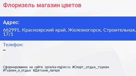 Флоризель, магазин цветов по адресу 662991, Красноярский край, Железногорск, Строительная, 17/1 в дальнейшем Организация, размещена в следующих категориях: