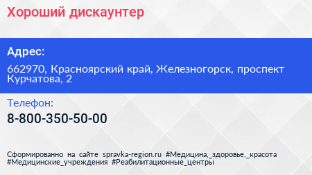 Хороший, дискаунтер по адресу 662970, Красноярский край, Железногорск, проспект Курчатова, 2 в дальнейшем Организация, размещена в следующих категориях: