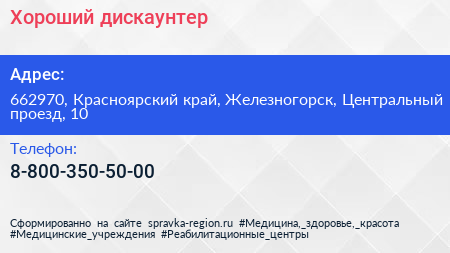 Хороший, дискаунтер по адресу 662970, Красноярский край, Железногорск, Центральный проезд, 10 в дальнейшем Организация, размещена в следующих категориях: