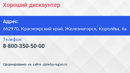 Хороший, дискаунтер по адресу 662970, Красноярский край, Железногорск, Королёва, 6а в дальнейшем Организация, размещена в следующих категориях: