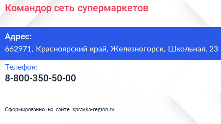 Командор, сеть супермаркетов по адресу 662971, Красноярский край, Железногорск, Школьная, 23 в дальнейшем Организация, размещена в следующих категориях: