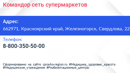 Командор, сеть супермаркетов по адресу 662971, Красноярский край, Железногорск, Свердлова, 22 в дальнейшем Организация, размещена в следующих категориях: