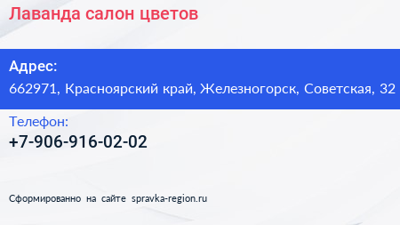 Лаванда, салон цветов по адресу 662971, Красноярский край, Железногорск, Советская, 32 в дальнейшем Организация, размещена в следующих категориях: