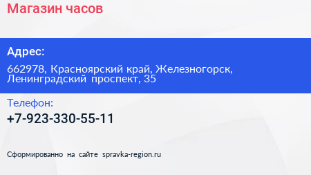 Магазин часов по адресу 662978, Красноярский край, Железногорск, Ленинградский проспект, 35 в дальнейшем Организация, размещена в следующих категориях: