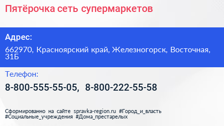 Пятёрочка, сеть супермаркетов по адресу 662970, Красноярский край, Железногорск, Восточная, 31Б в дальнейшем Организация, размещена в следующих категориях: