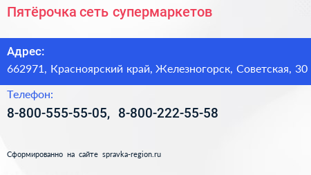 Пятёрочка, сеть супермаркетов по адресу 662971, Красноярский край, Железногорск, Советская, 30 в дальнейшем Организация, размещена в следующих категориях:
