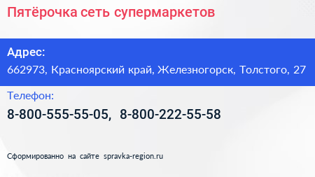 Пятёрочка, сеть супермаркетов по адресу 662973, Красноярский край, Железногорск, Толстого, 27 в дальнейшем Организация, размещена в следующих категориях: