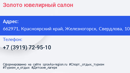 Золото, ювелирный салон по адресу 662971, Красноярский край, Железногорск, Свердлова, 10 в дальнейшем Организация, размещена в следующих категориях: