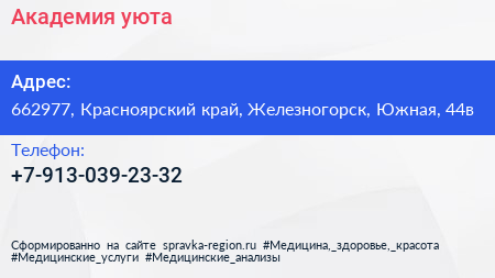 Академия уюта по адресу 662977, Красноярский край, Железногорск, Южная, 44в в дальнейшем Организация, размещена в следующих категориях: