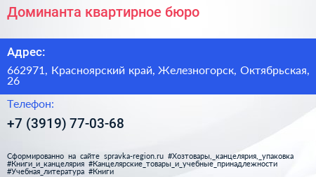 Доминанта, квартирное бюро по адресу 662971, Красноярский край, Железногорск, Октябрьская, 26 в дальнейшем Организация, размещена в следующих категориях: