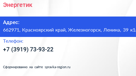 Энергетик по адресу 662971, Красноярский край, Железногорск, Ленина, 39 к1а в дальнейшем Организация, размещена в следующих категориях: