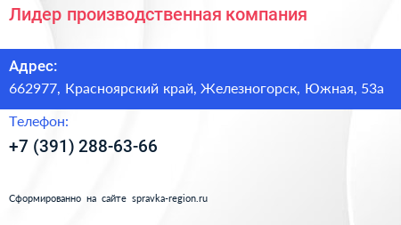 Лидер, производственная компания по адресу 662977, Красноярский край, Железногорск, Южная, 53а в дальнейшем Организация, размещена в следующих категориях: