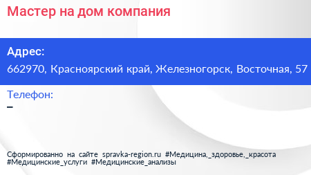 Мастер на дом, компания по адресу 662970, Красноярский край, Железногорск, Восточная, 57 в дальнейшем Организация, размещена в следующих категориях: