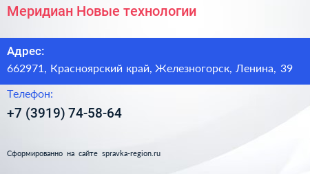 Меридиан Новые технологии по адресу 662971, Красноярский край, Железногорск, Ленина, 39 в дальнейшем Организация, размещена в следующих категориях: