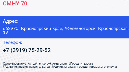 СМНУ-70 по адресу 662970, Красноярский край, Железногорск, Красноярская, 19 в дальнейшем Организация, размещена в следующих категориях: